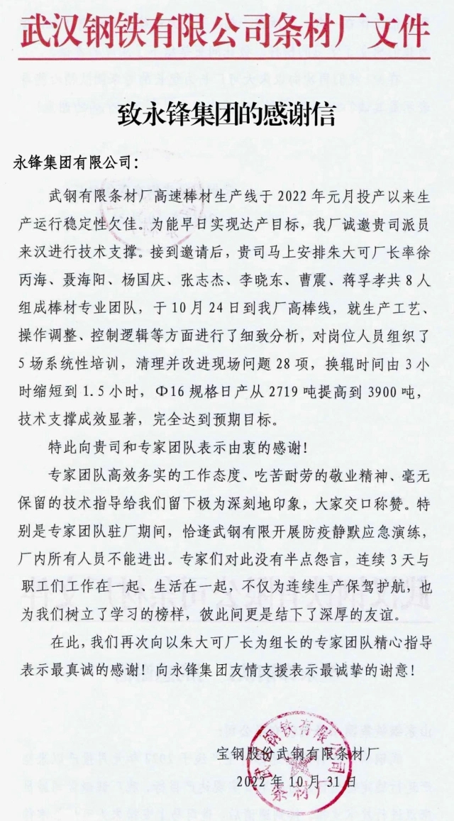 武漢鋼鐵發(fā)來(lái)一封感謝信